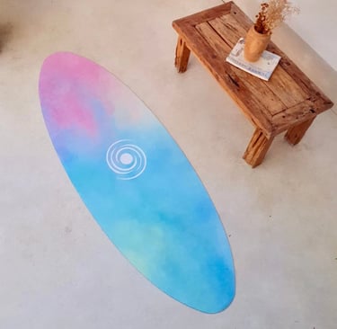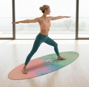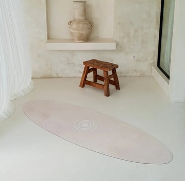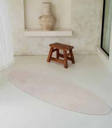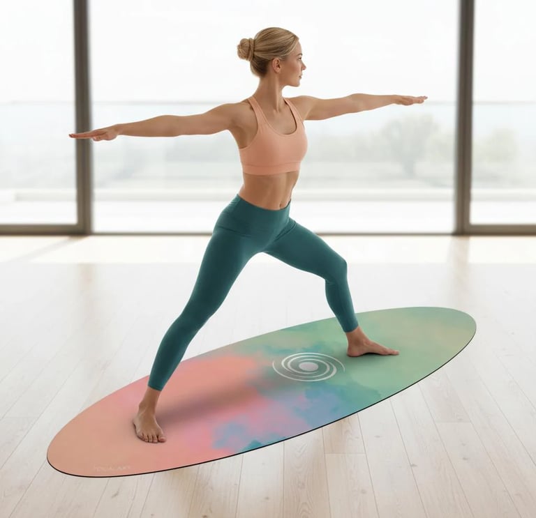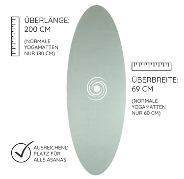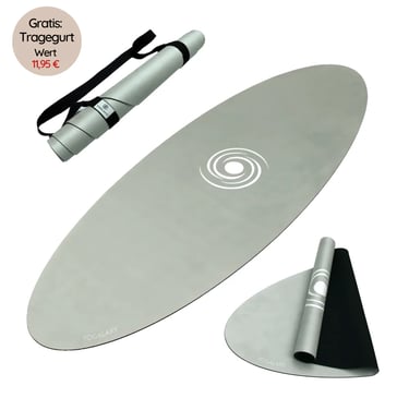 Ein weiteres besonderes Merkmal ist das ovale Design. Diese Form sieht nicht nur modern und elegant aus, sie verändert auch das Gefühl auf der Matte. Durch die Rundungen fühlst du dich weniger eingeengt als auf einer klassischen rechteckigen Matte. Drehungen, fließende Abläufe und freie Bewegungen wirken natürlicher, fast so, als würdest du dich auf einer kleinen Insel bewegen, die nur dir gehört.